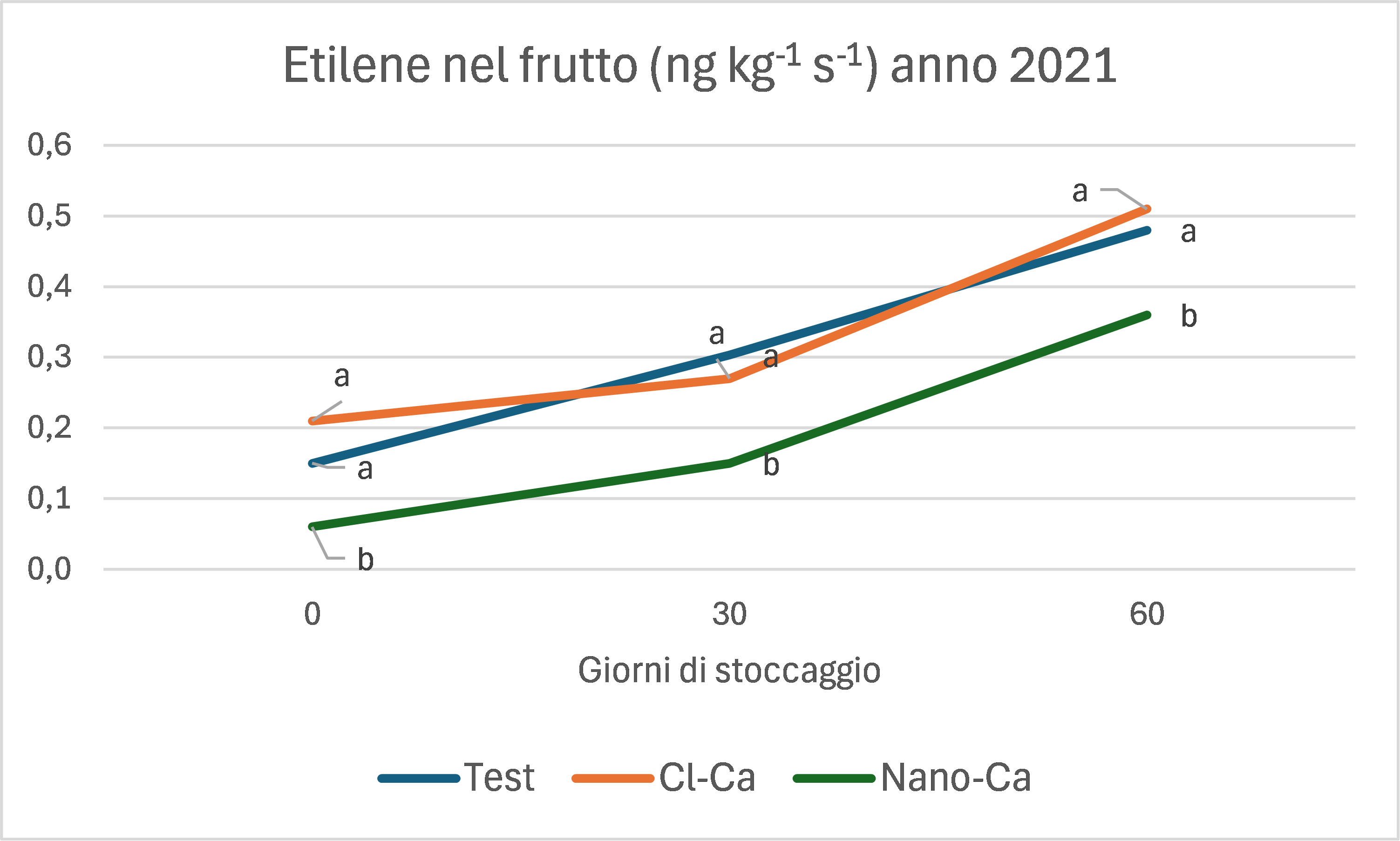 Figura 2 – Produzione di etilene nel frutto. Lettere diverse indicano differenze significative (P ≤ 0,05). Fonte: *1