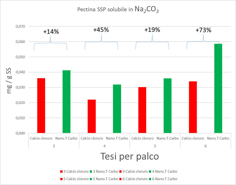 Dal grafico sottostante è possibile vedere che per ogni palco considerato, la quantità media di pectato di calcio poco solubile (SSP) in carbonato di sodio è superiore nella tesi trattata con Nano.T Carbo rispetto al formulato tradizionale, con percentuali che arrivano anche oltre il 70%.