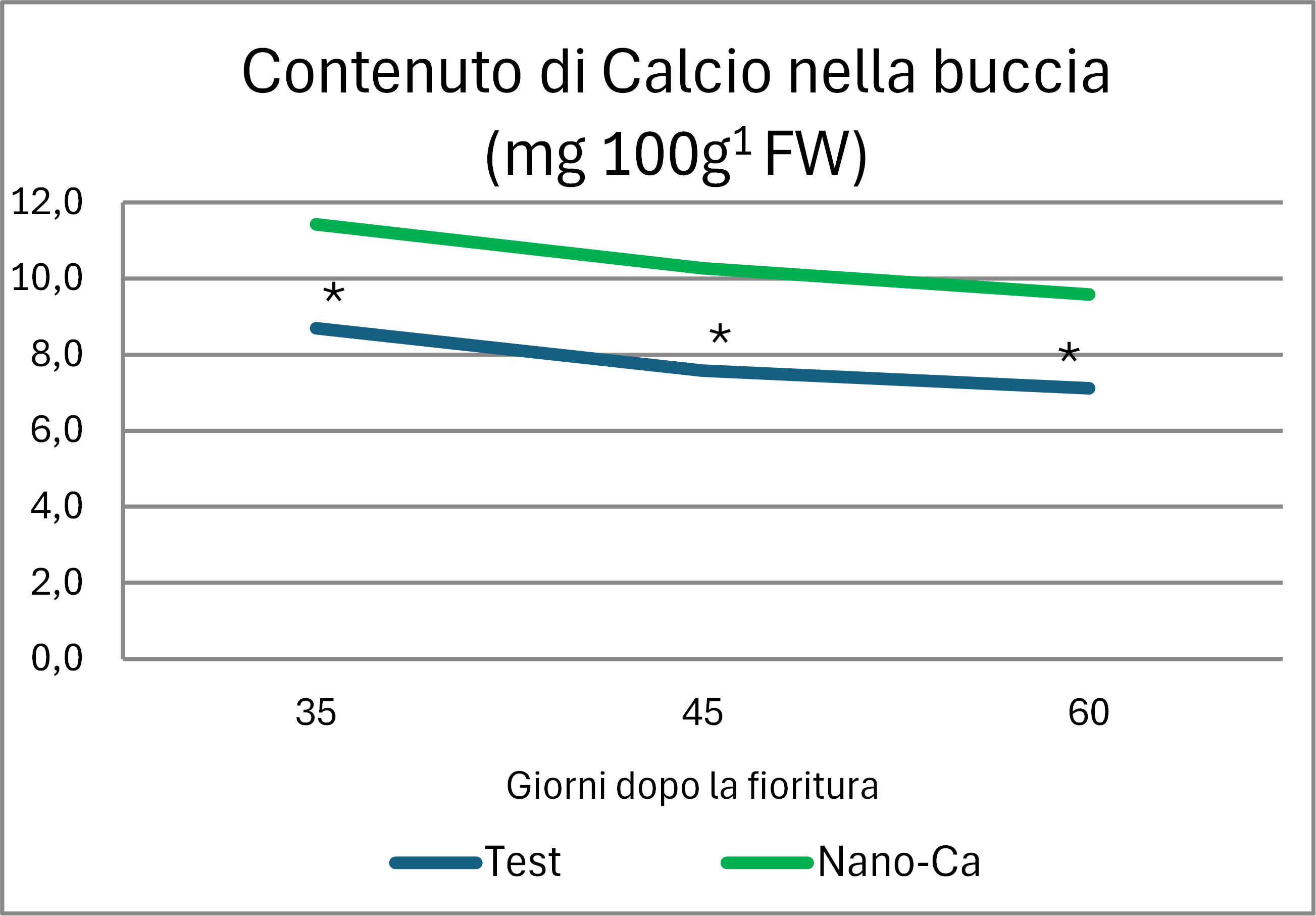 L’ assorbimento del calcio in forma nano è verificabile anche per quanto riguarda il suo contenuto nella buccia come dimostra il seguente grafico sulla nettarina, una coltura tendenzialmente più sensibile alle spaccature rispetto alla pesca.