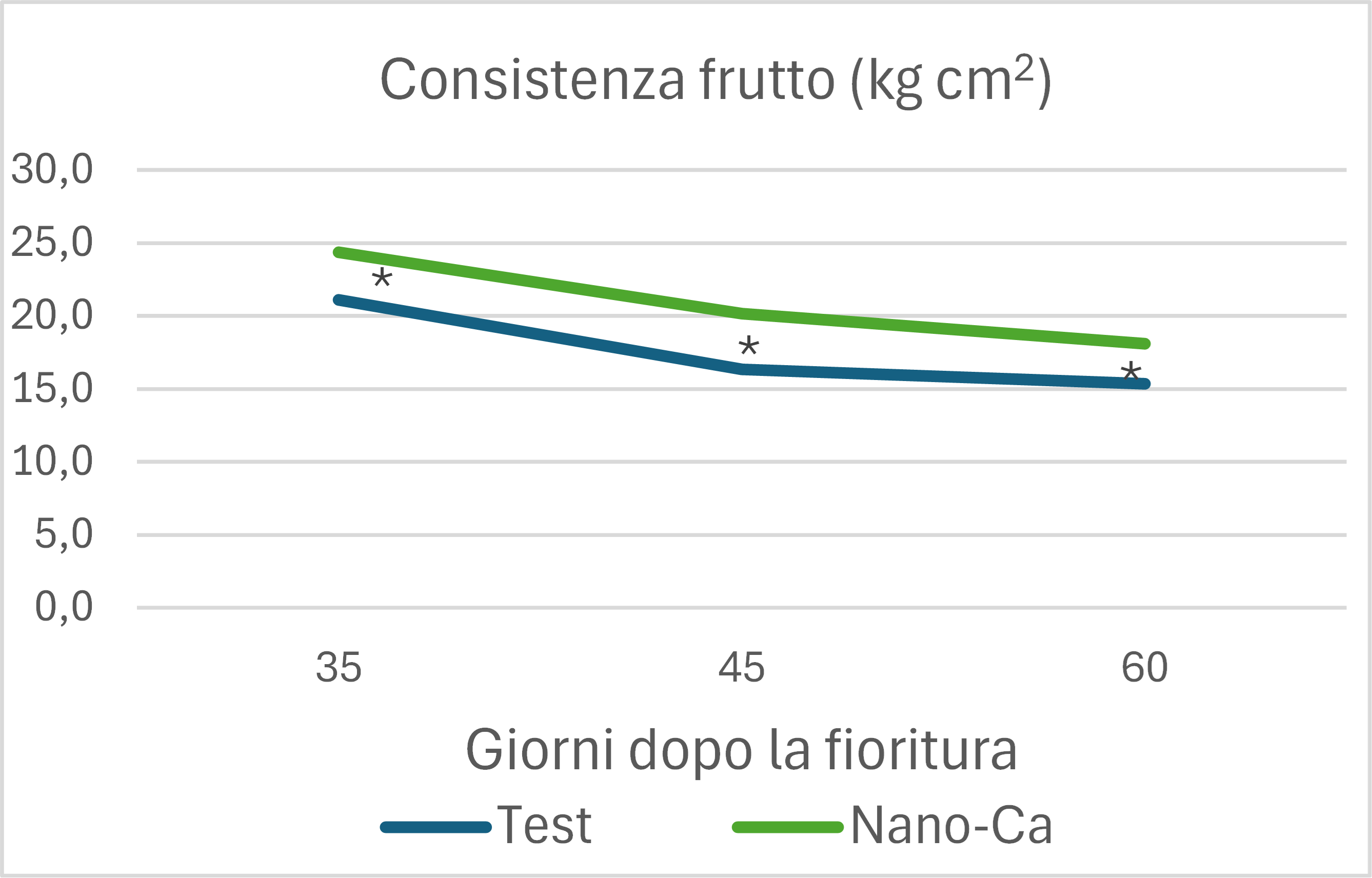 Figura 4 – Effetto del trattamento con nano-Ca sulla consistenza della nettarina misurata con un penetrometro. I dati sono le medie ± ES di tre repliche. *Gli asterischi rappresentano differenze significative (P ≤ 0.005). Fonte: *2