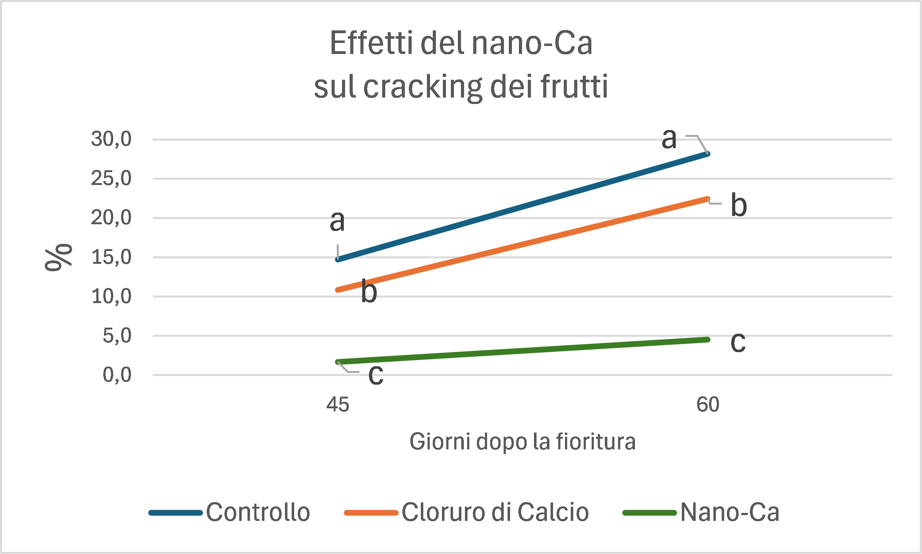 Figura 7 – Effetti del trattamento con cloruro di calcio e nano-Ca sulla spaccatura dei frutti di nettarina. I dati sono le medie ± ES di tre repliche. Lettere diverse indicano differenze significative (P ≤ 0,05). Fonte: *2