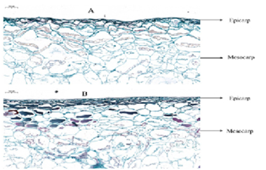 Figura 6 – Osservazione della microstruttura della buccia a 45 DAFB nel 2021. Controllo (A) e trattamento con nano-Ca (B). In B la buccia si mostra più regolare e compatta. Fonte: *2