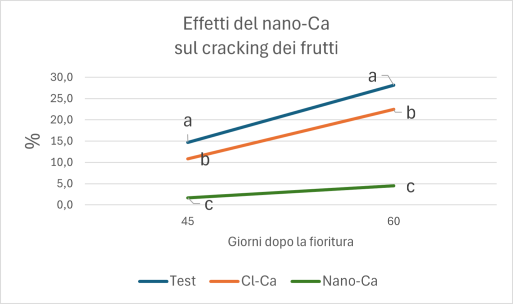 - Riduzione del fenomeno del cracking, le spaccature nella frutta sono infatti spesso correlate a una ridotta presenza di calcio nellla buccia (vedi grafico sopra sulla % di cracking nelle nettarine).
