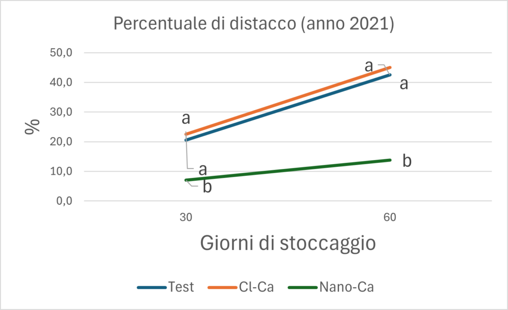 - Mantenimento di una bassa percentuale di distacco degli acini (vedi grafico sopra sulla % di distacco degli acini nell’uva da tavola).